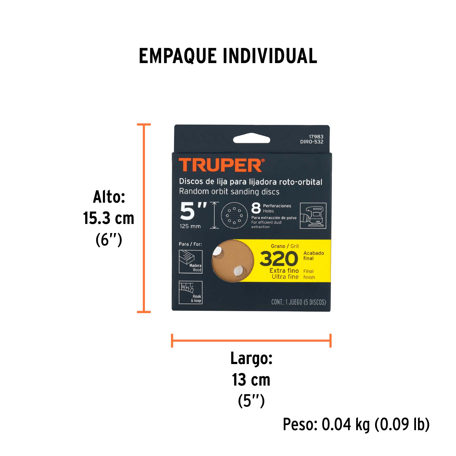 Paquete con 5 discos de lija 5" grano 320, 8 perforaciones